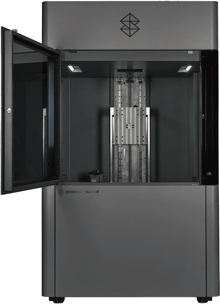 A Stratasys Neo800 é uma impressora 3D SLA de última geração, voltada para aplicações industriais que exigem grande volume, qualidade de superfície superior e alta repetibilidade. Com volume de construção de 800 × 800 × 600 mm, ela permite imprimir peças inteiras, reduzindo tempo e custo com montagem ou pós-processamento. Sua arquitetura aberta de resinas, combinada ao poderoso software Titanium, garante liberdade total para desenvolver aplicações específicas com controle total do processo.